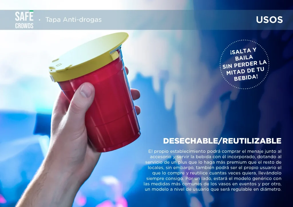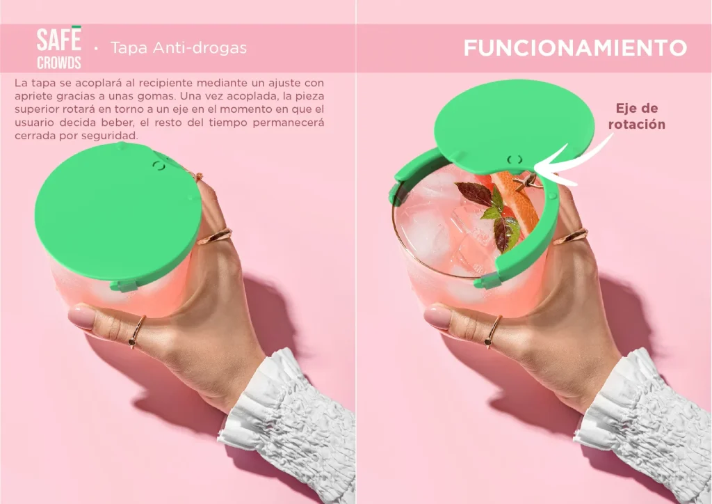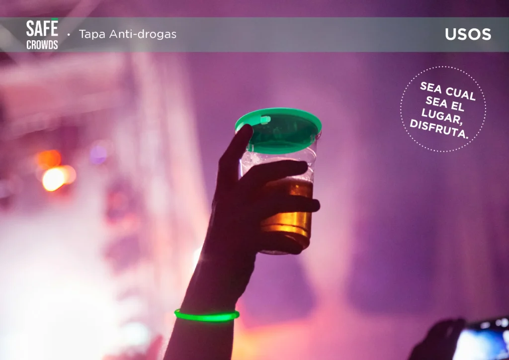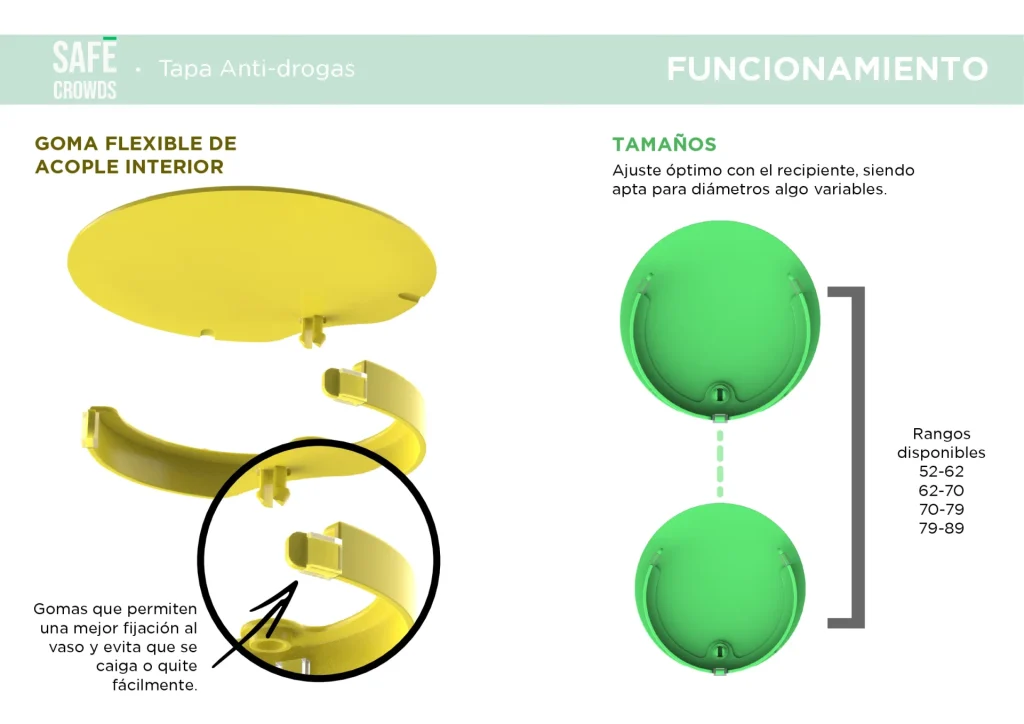 La tapa Safe Crowds ha sido diseñada como un sistema de control de accesos negativo para sustancias externas, actuando como una barrera física infranqueable para tu bebida. Este dispositivo de seguridad proactiva en espacios públicos se ajusta a diferentes diámetros de vasos, permitiendo disfrutar de la fiesta con total tranquilidad.